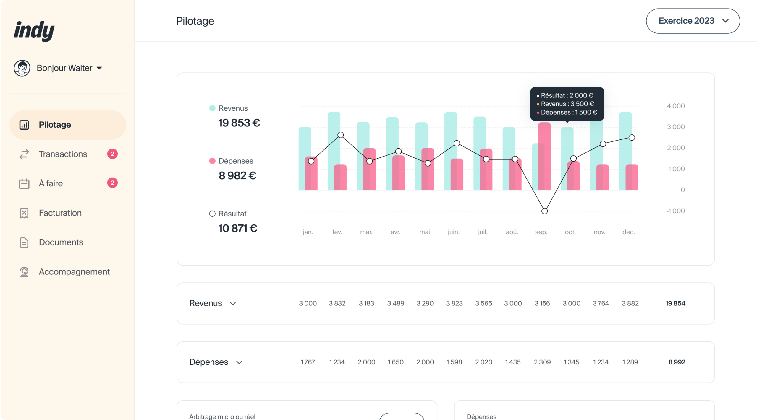 ✅ Le tableau de bord avec tes stats (CA, dépenses, etc.)